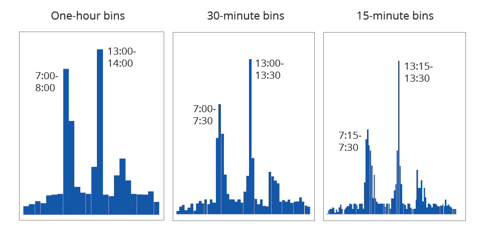 In this example, adapted from a dataset for a media website, we would end up using the 15-minute bins, because this gives our audience the most useful information. Yes, most website users visit the site at lunchtime - between 13:00 and 14:00 as the first chart shows. But what’s even more surprising is that, within that one-hour slot, the majority of users visit between 13:15 and 13:30, fifteen minutes after their lunch hour starts, presumably after they’d picked up a sandwich and started to eat it al desko.