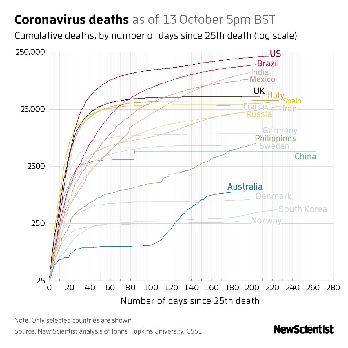 Let's look at why this might be a problem. Here's a chart of cumulative Covid deaths, adapted from an original produced by the New Scientist in October 2020.