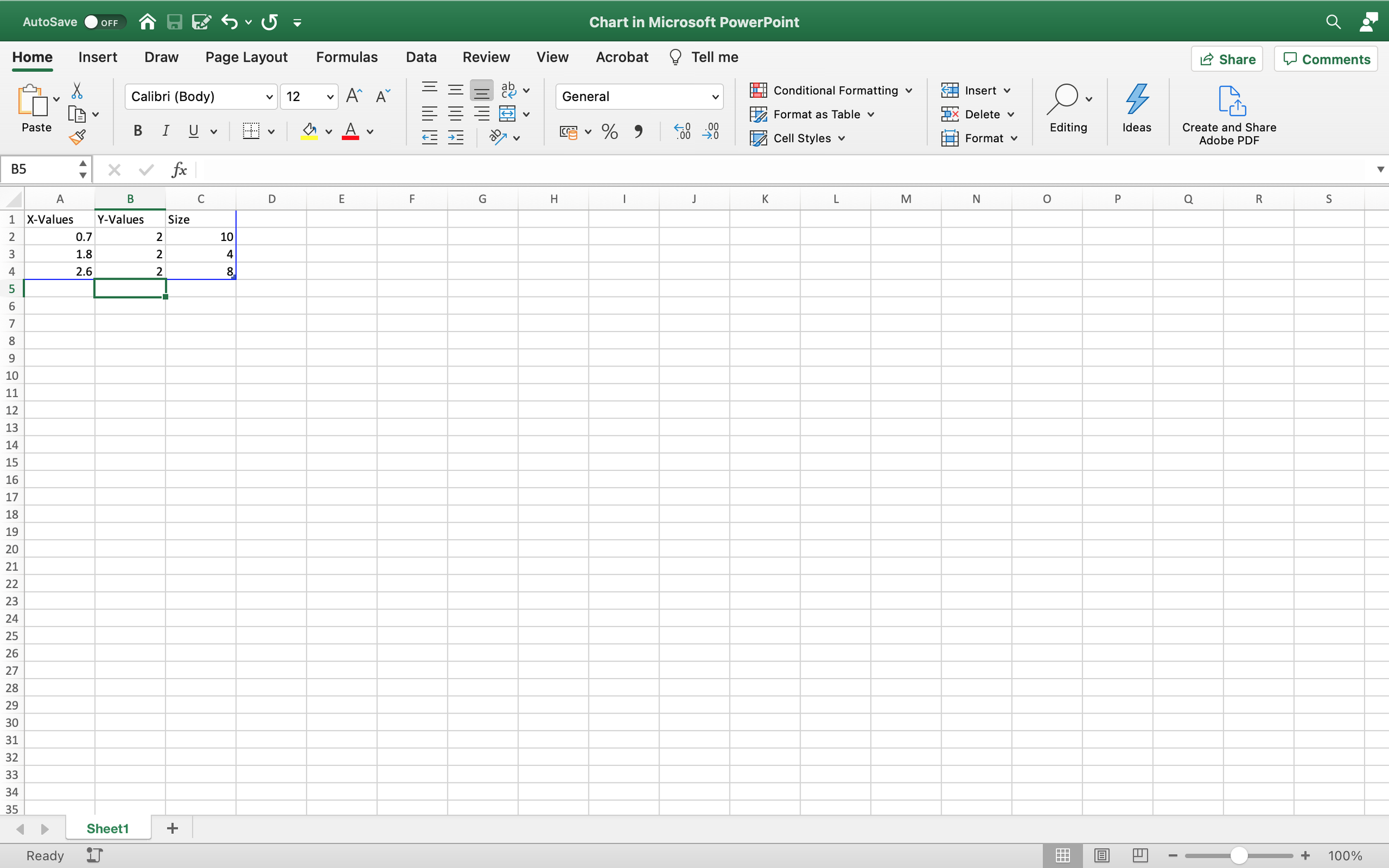 PowerPoint will drop in a Bubble Chart and open an Excel spreadsheet with sample data in it