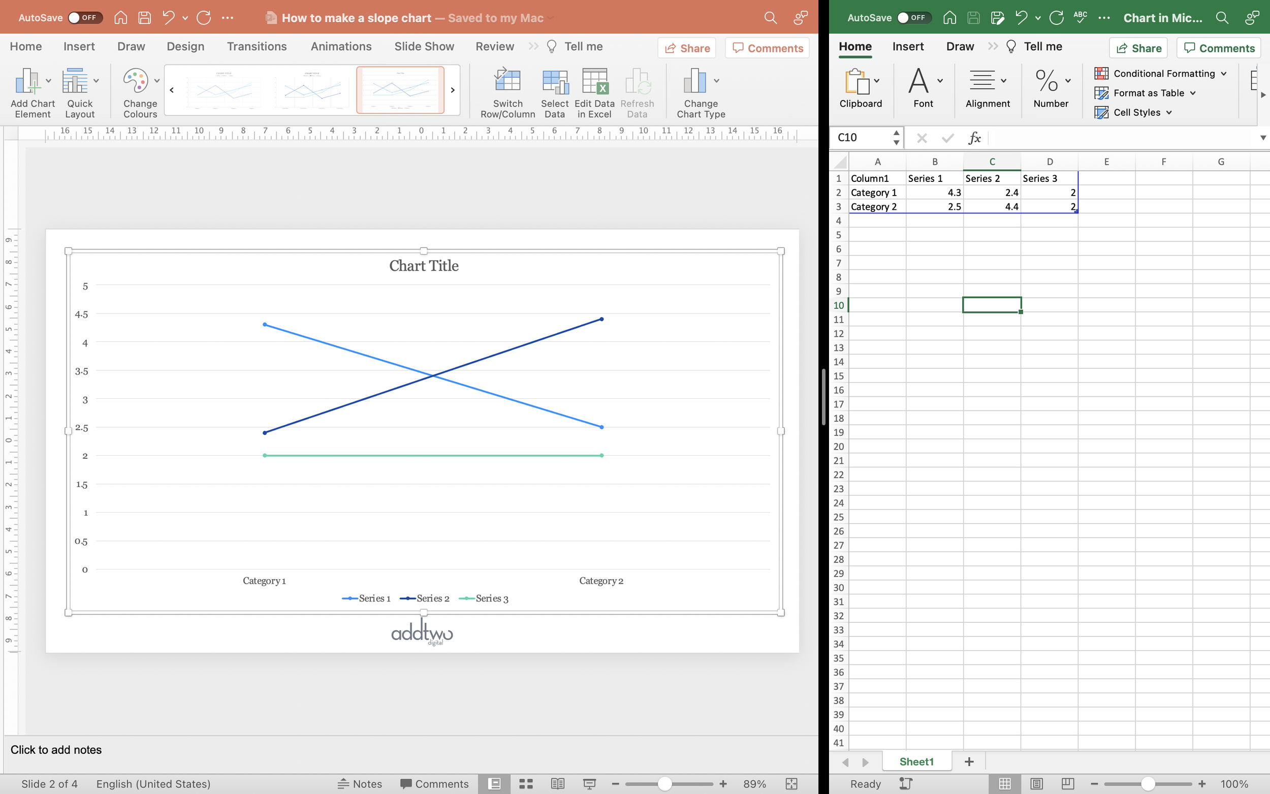 For a slope chart, we only want two points on the x-axis, a beginning and ending, so let’s delete the bottom two rows of data in the spreadsheet.