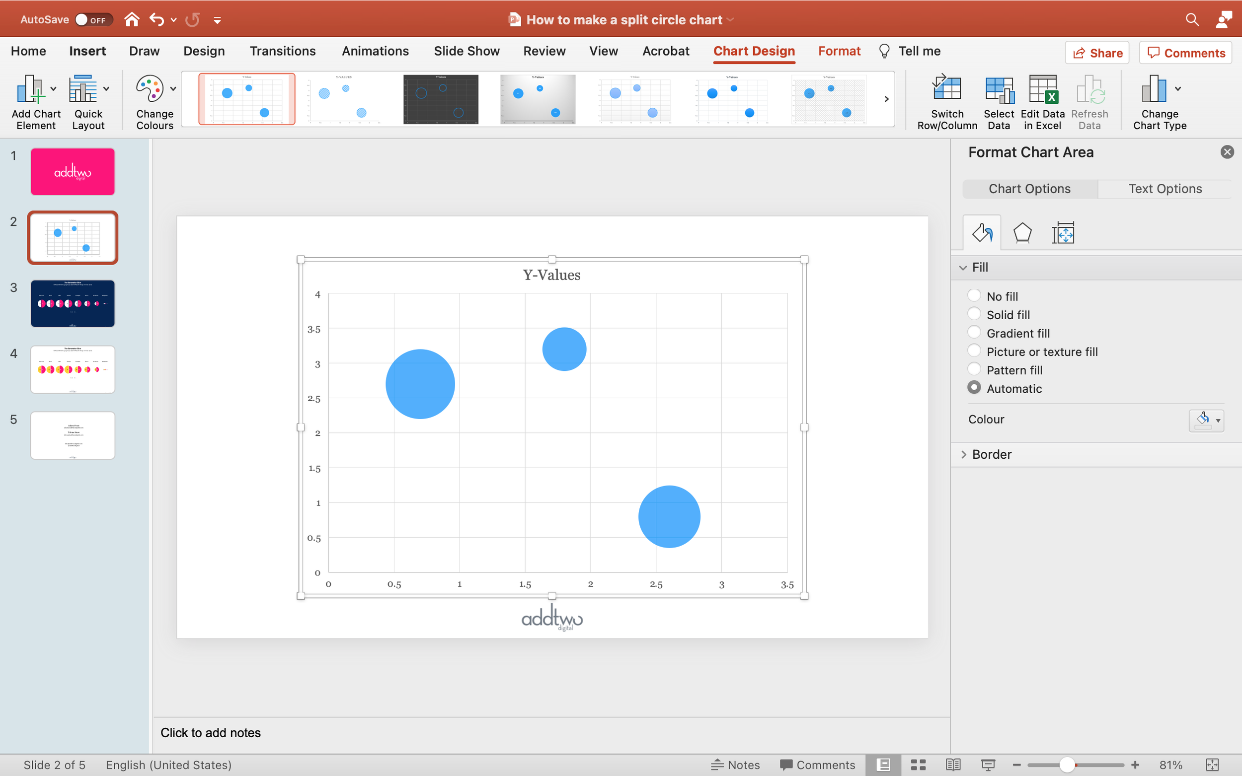 The single split circle looks a little lonely in the middle of the screen there, but PowerPoint gives us a quick tool for scaling up bubbles without losing their relative size