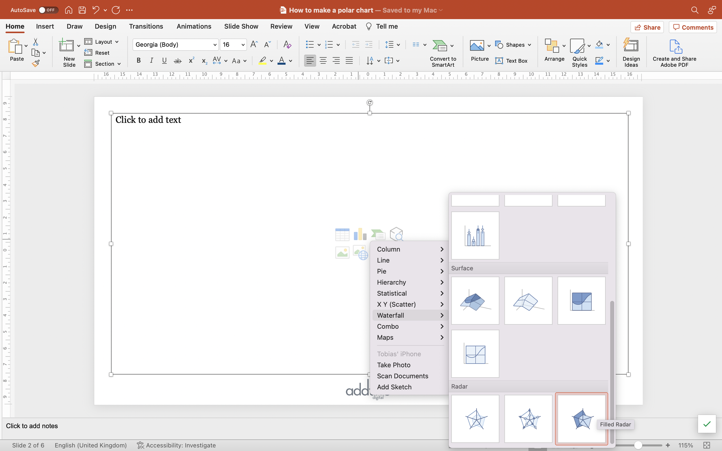 We’re going to start by inserting a Filled Radar chart. They’re buried away under the ‘Waterfall’ group of charts in the PowerPoint insert chart menu, right at the bottom, which is where they should be. Filled Radar charts are one of the most misused charts in the library, largely because they shouldn’t be used at all. Ghastly things.